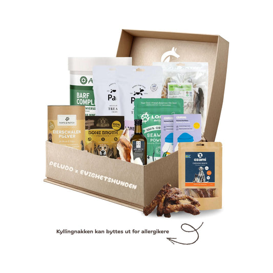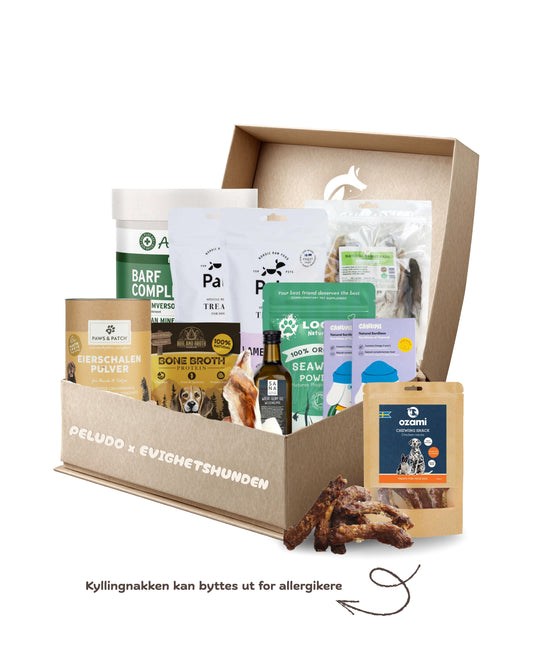Startkassen er satt sammen av Evighetshundes Kjøkken for å gjøre det enkelt å lage hjemmelaget mat til hund. Kassene inneholder alt nødvendig som sikrer riktig næringsbalanse – du trenger bare å legge til kjøtt og eventuelle grønnsaker.