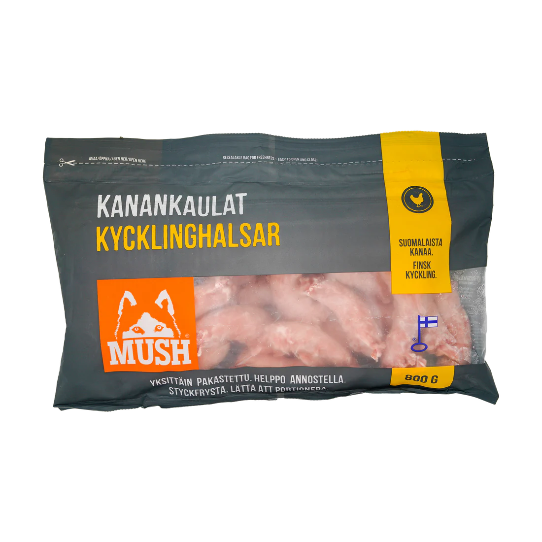 MUSH Kycklinghalser er rå kyllinghalser som kan brukes både som snacks og som en del av måltidet. Dette er et tilleggsfôr for hund og katt, og bør inngå i et variert kosthold.