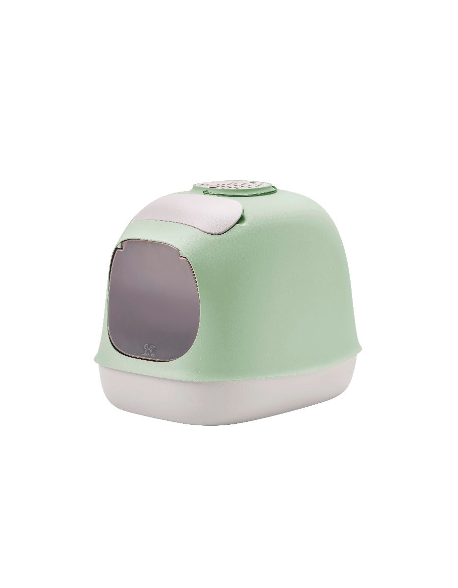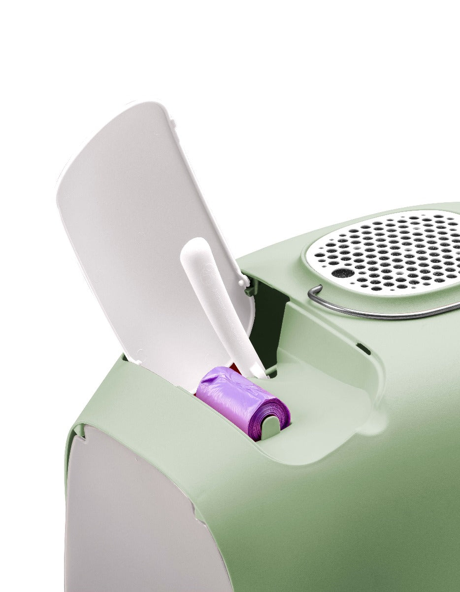 Minù kattedo – Den buede formen passer perfekt inn i hjemmemiljøet og gir et preg av design til ethvert hjem. Den er utstyrt med et utskiftbart aktivt kullfilter, skjult inni kroppen, en praktisk skje for rengjøring av kattedosen, som løftes automatisk så snart toppdøren åpnes, og en rull med hygieneposer.